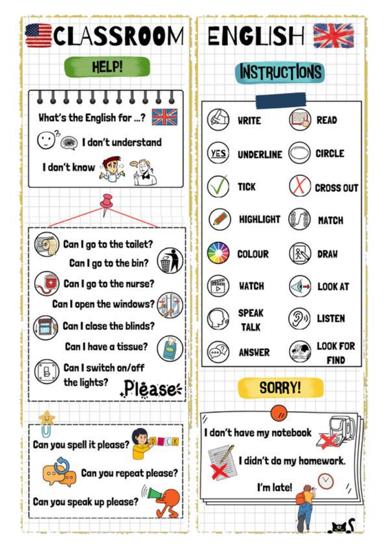 Classroom English bookmark à distribuer aux élèves.