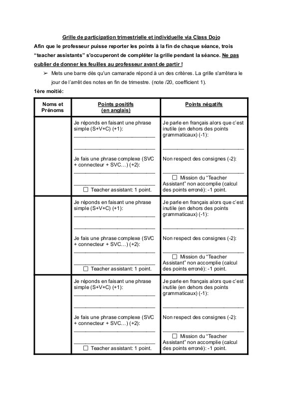 Grille De Participation Trimestrielle Via Class Dojo. (Version 2025)