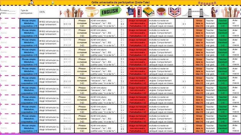 Nouvelle grille de participation à tester avec les élèves. Ils doivent juste cocher les cases pour les camarades et peuvent remplir la feuille en duo. Cela donnera une note par trimestre sur 20, coefficient 1. Le but de cette grille est de noter la progression constante des élèves et non la performance.