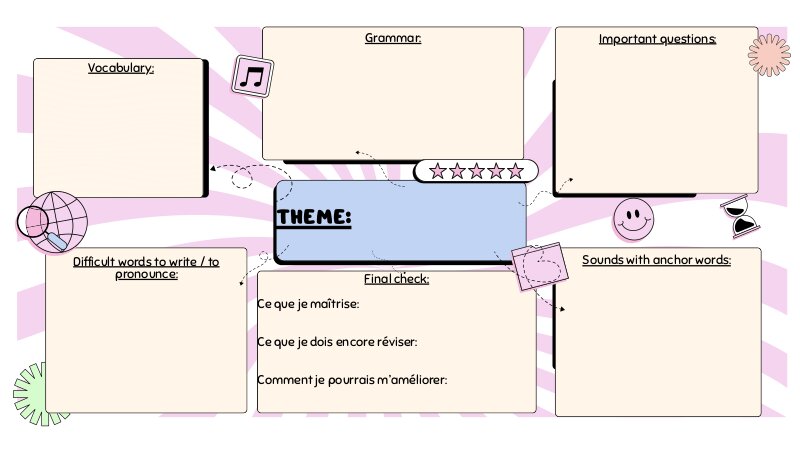 Mind-map à coller à la fin de chaque séquence pour réviser toutes les leçons et trier les informations afin de se préparer pour le projet final de chacune d'entre elle. S'ensuit la semaine de révision avant la date du contrôle.