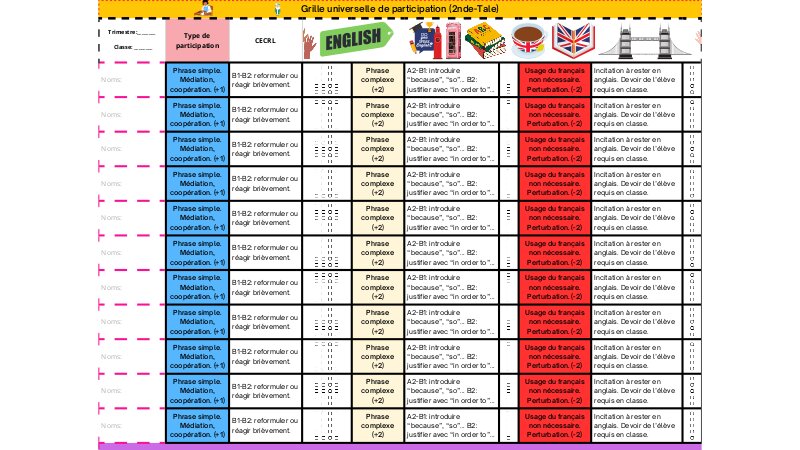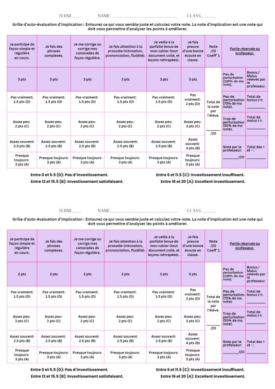 Voici la version 2026, où les élèves s'auto-évaluent, avec un système de bonus/malus inscrit dans le carnet du professeur, le tout donnant à une note finale trimestrielle.