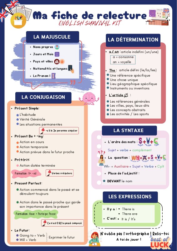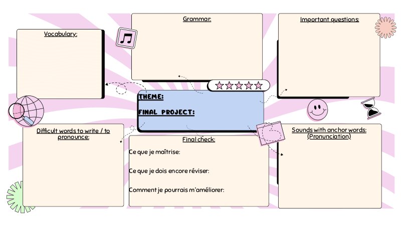 Mind-map à coller en début de chaque séquence pour réviser progressivement toutes les leçons et trier les informations afin de se préparer pour le projet final de chacune d'entre elle. S'ensuit la semaine de révision avant la date du contrôle.