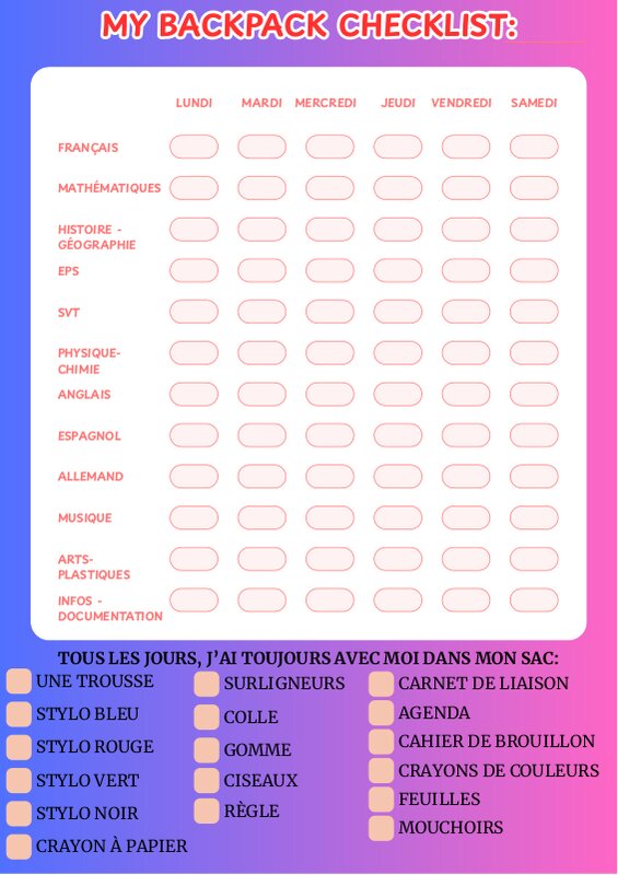 Checklist à partager en heure de vie de classe en 6e, pour apprendre à bien faire son sac la veille au soir, pour le lendemain.