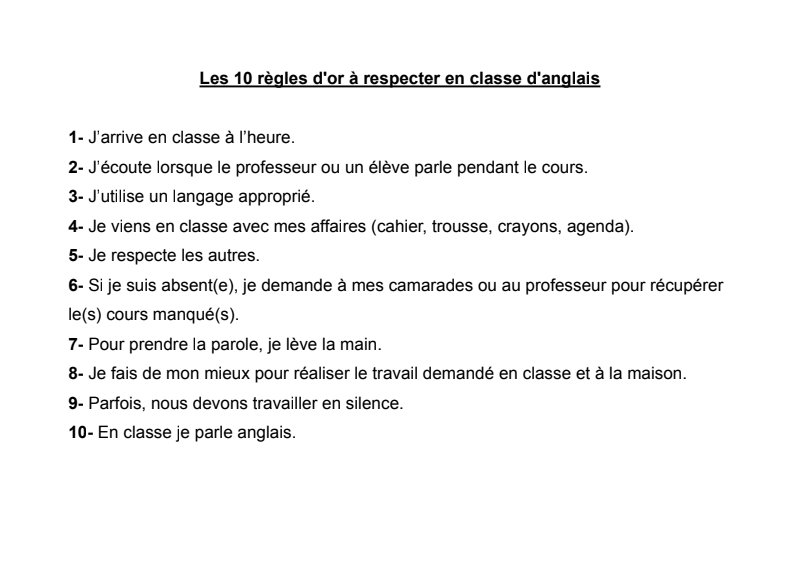 Les 10 Règles D'Or En Classe D'Anglais
