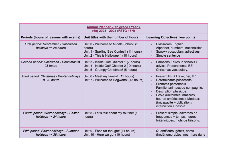 Annual Planner 6Th Grade / Year 7 (6e): FSTG 18h, 2023-2024.