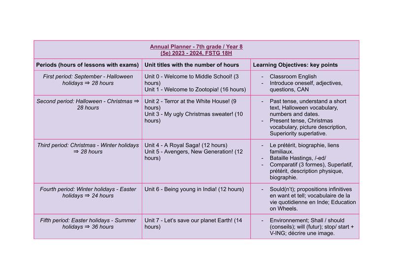 Annual Planner 7Th Grade / Year 8 (5e): FSTG 18h, 2023-2024.